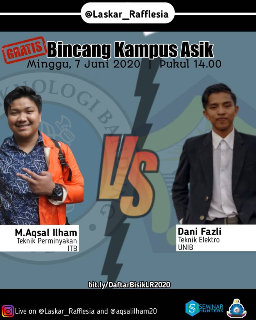 Laskar Rafflesia kembali hadir, kali ini dengan wajah yang berbeda, yakni akan mengupas tuntas tentang Institut Teknologi bandung khususnya serta Universitas Bengkulu, Kepo dengan bincang yang mereka lakukan? yuk segera daftarkan diri anda sebagai salah satu saksi pembicaraan mereka.